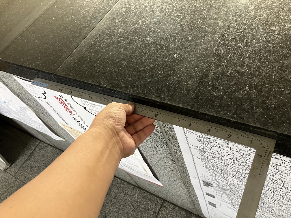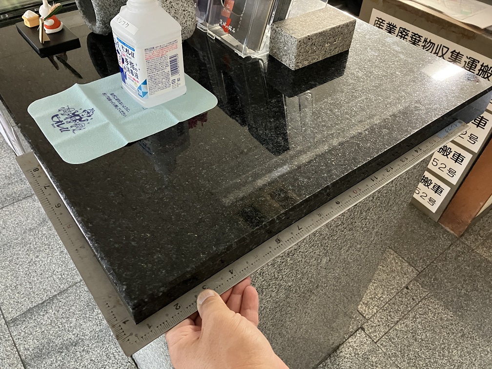 この画像は、昭和の時代につくられた弊社事務所の石のカウンターに差し金をあてたものです。ちなみに銘柄は福島の「浮金石」です。