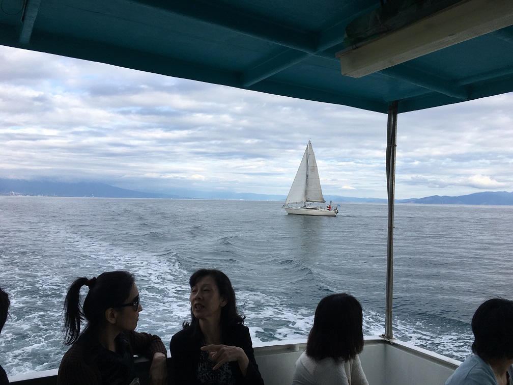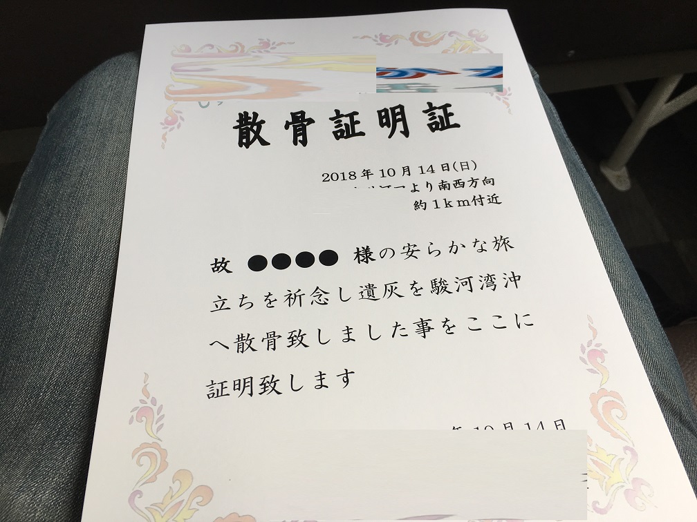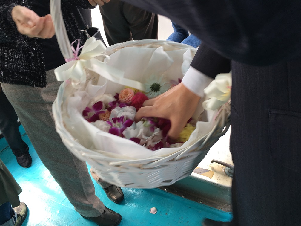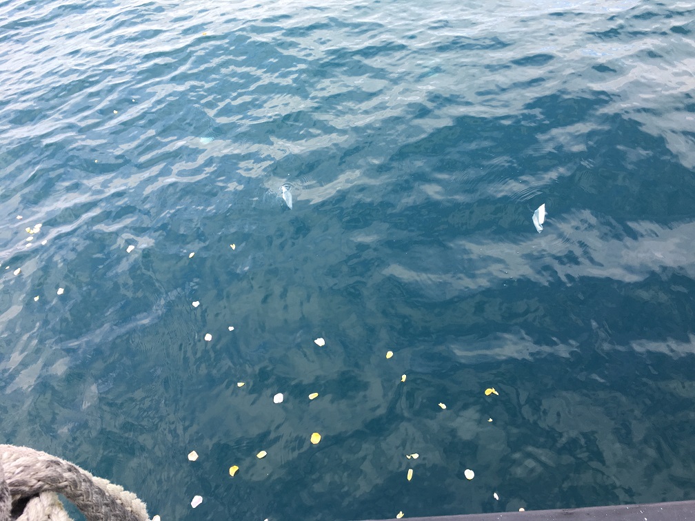 海洋散骨は〇〇の遊覧船からそれほど沖まではいかず、散骨のデモを行いました。