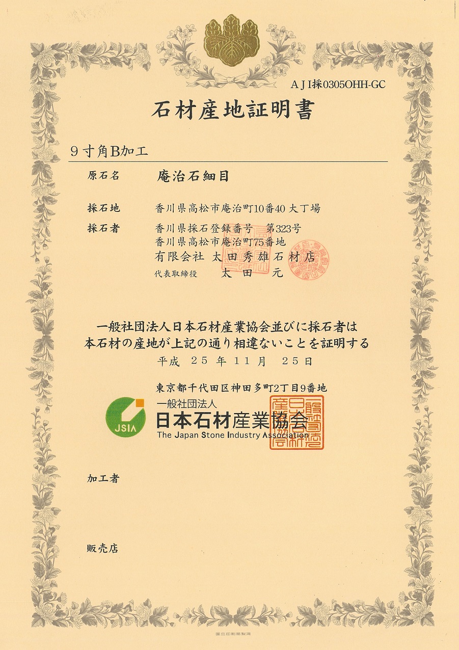 石材産地証明書、これがあると全然違います30年ほど前、有名な企業の産地偽証が大きな問題になった時期がありました。