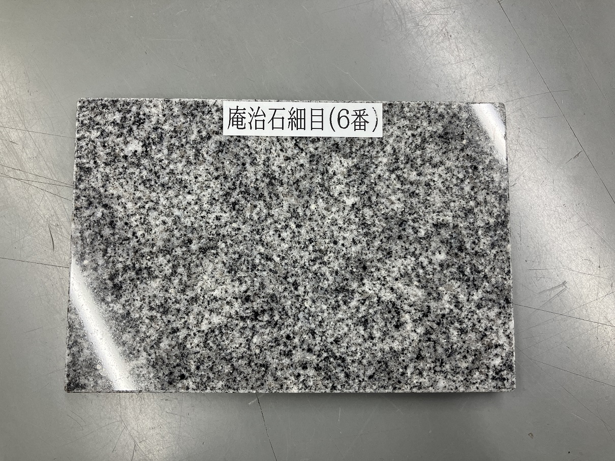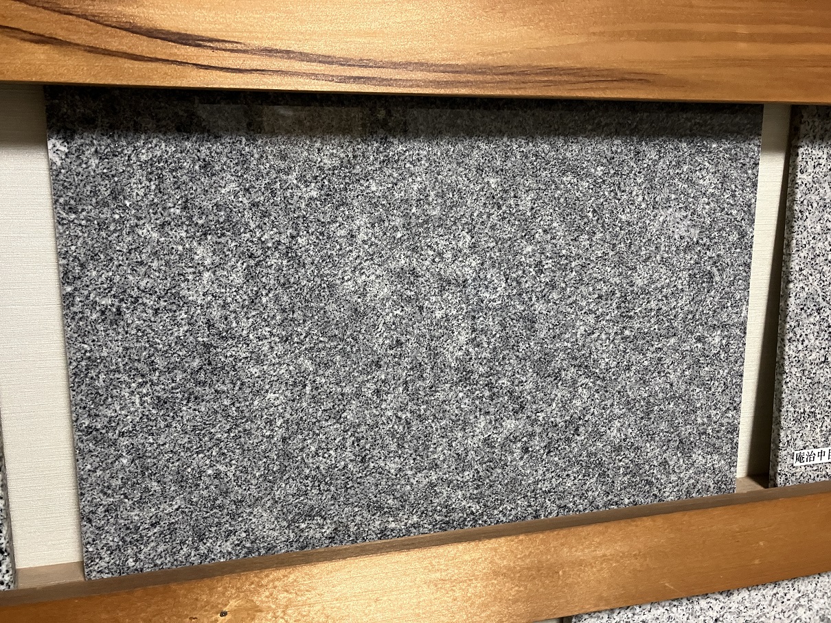 ……ま、こんな感じ。もやっとした印象で、石目の細かさも、独特の**斑(ふ)**も、なんかぼんやりみえています。これだけでは高級感は感じられず、「庵治細目でお墓建てたらどうなるんだろう?」ってイメージはあまり湧かないと思います。